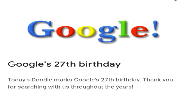 കഴിഞ്ഞ 27 വർഷങ്ങളായി കൂട്ടുകാരനെ പോലെയാണ് ഗൂഗിൾ നമുക്കൊപ്പം നിൽക്കുന്നത്. ഇപ്പോൾ 27ാം ജന്മദിനത്തിൽ നൊസ്റ്റാൾജിയ ഡൂഡിലുമായിട്ടാണ് ഗൂഗിൾ വന്നിരിക്കുന്നത്. ഹോംപേജിൽ ഗൂഗിളിന്റെ ആദ്യത്തെ ലോഗോ ഡൂഡിലായി അവതരിപ്പിച്ചാണ് ഇത്തവണ ജന്മദിനം ആഘോഷിക്കുന്നത്.