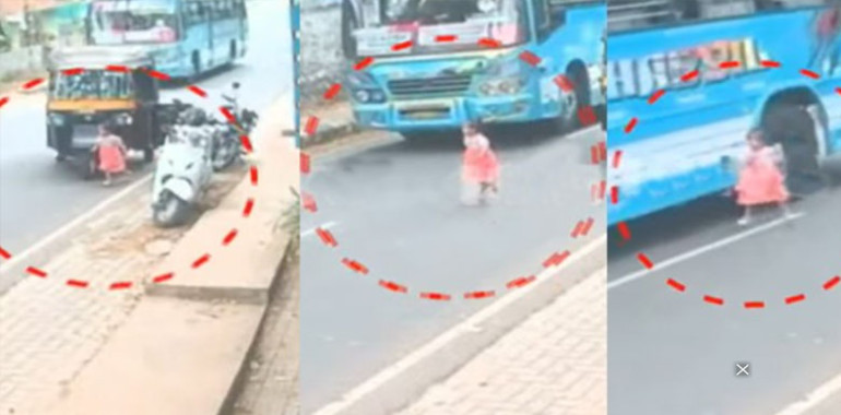 സ്വകാര്യ ബസിന്റെ മുന്നിൽ നിന്നും തലനാരിഴയ്ക്കു രക്ഷപ്പെട്ട് കുഞ്ഞ് !! രക്ഷിതാക്കൾ ശ്രദ്ധിക്കുക ...