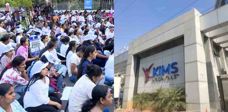 ശമ്പള വർദ്ധനവ് ആവശ്യപ്പെട്ട് സംസഥാനത്തെ സ്വകാര്യ ആശുപത്രികളിലെ നഴ്സുമാർ നടത്തുന്ന സമരത്തിന് ഫലം കണ്ടു തുടങ്ങുന്നു : കൃഷ്ണ ഇന്സ്റ്റിറ്റ്യൂട്ട് ഓഫ് മെഡിക്കല് സയന്സിലെ (കിംസ്) നഴ്സുമാരുടെ അടിസ്ഥാന ശമ്പളം 40,000 രൂപയാക്കി ഉയര്ത്തി