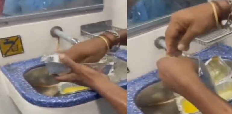 ഡിസ്പോസിബിൾ ഫുഡ് കണ്ടെയ്നറുകൾ കാറ്ററിങ് ജീവനക്കാരൻ യാത്രക്കാരുടെ കമ്പാർട്ട്മെന്റിലിട്ടായിരുന്നു കഴുകിയത്. എന്തിനാണ് ഇത് കഴുകുന്നതെന്ന് യാത്രക്കാരൻ ജീവനക്കാരനോട് ചോദിക്കുന്നതും പുറത്തുവന്ന ദൃശ്യങ്ങളിൽ കേൾക്കാൻ സാധിക്കും.