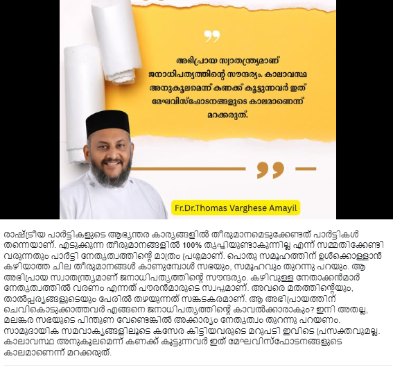 പൊതുസമൂഹത്തിന് ഉൾക്കൊള്ളാൻ കഴിയാത്ത കാര്യങ്ങൾ കാണുമ്പോൾ സഭകൾ തുറന്നു പറയും. മലങ്കര സഭയുടെ പിന്തുണ വേണ്ടെങ്കിൽ അക്കാര്യം നേതൃത്വം തുറന്നു പറയണം. സാമുദായിക സമവാക്യങ്ങളിലൂടെ കസേര കിട്ടിയവരുടെ മറുപടി ഇവിടെ പ്രസക്തവുമല്ല. കാലാവസ്ഥ അനുകൂലമെന്ന് ചിലർ കണക്ക് കൂട്ടുന്നു. എന്നാൽ ഇത് മേഘവിസ്ഫോടനങ്ങളുടെ കാലമാണെന്ന് മറക്കരുത്. സാമുദായിക സമവാക്യങ്ങളിലൂടെ കസേര കിട്ടിയവരുടെ മറുപടി ഇവിടെ പ്രസക്തവുമല്ലെന്ന് വൈദീക ട്രസ്റ്റി ഫാ. ഡോ. തോമസ് വർഗീസ് അമയിൽ പറഞ്ഞു.
