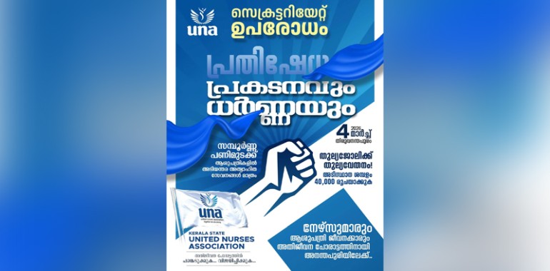 യൂണൈറ്റഡ് നഴ്സസ് അസോസിയേഷൻ (UNA) യുടെ നേതൃത്വത്തിൽ സംസ്ഥാനത്തെ പ്രൈവറ്റ് ആശുപത്രികളിലെ നഴ്സുമാർ ഇന്ന് സെക്രട്ടേറിയറ്റ് ഉപരോധ ധർണ സംഘടിപ്പിക്കും