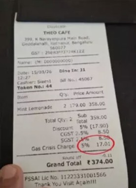 രാജ്യത്ത് പാചകവാതക ക്ഷാമം ഹോട്ടല്‍ മേഖലകളിലടക്കം കടുത്ത പ്രതിസന്ധി ഉയര്‍ത്തുന്നതിനിടെ ബെംഗളൂരുവിലെ ഒരു കഫേ ഉപഭോക്താവില്‍ നിന്ന് 'ഗ്യാസ് ക്രൈസിസ് ചാര്‍ജ്' ഈടാക്കിയത് സമൂഹമാധ്യമങ്ങളില്‍ വലിയ ചര്‍ച്ചയാകുന്നു